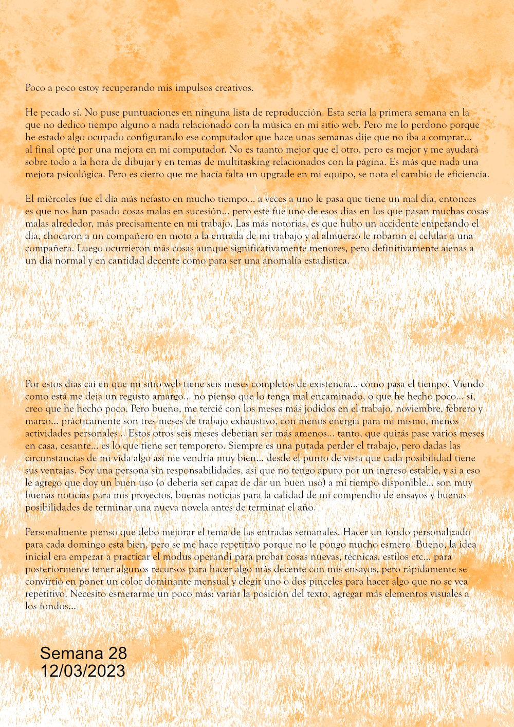 Personalmente pienso que debo mejorar el tema de las entradas semanales. Hacer un fondo personalizado para cada domingo está bien, pero se me hace repetitivo porque no le pongo mucho esmero. Bueno, la idea inicial era empezar a practicar el modus operandi para probar cosas nuevas, técnicas, estilos etc… para posteriormente tener algunos recursos para hacer algo más decente con mis ensayos, pero rápidamente se convirtió en poner un color dominante mensual y elegir uno o dos pinceles para hacer algo que no se vea repetitivo. Necesito esmerarme un poco más: variar la posición del texto, agregar más elementos visuales a los fondos…